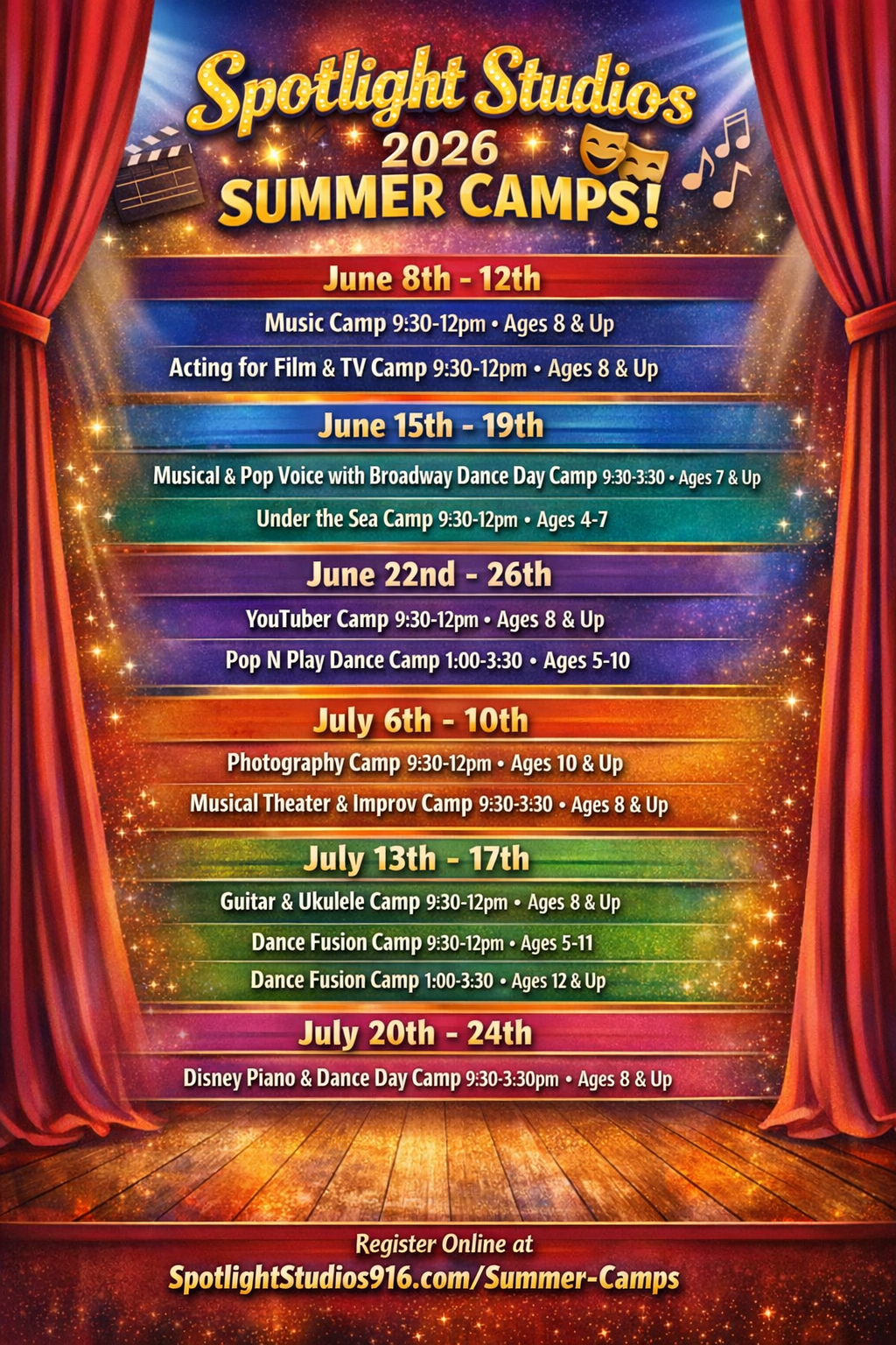 We are excited to offer 11 camps this year with 3 of them being Day Camps! To register add the camp(s) you wish to purchase to cart and proceed. You will enter all info upon checkout. You will received an email with all the specifics for the camp a week prior to the start date! Thank you for joining us this Summer!